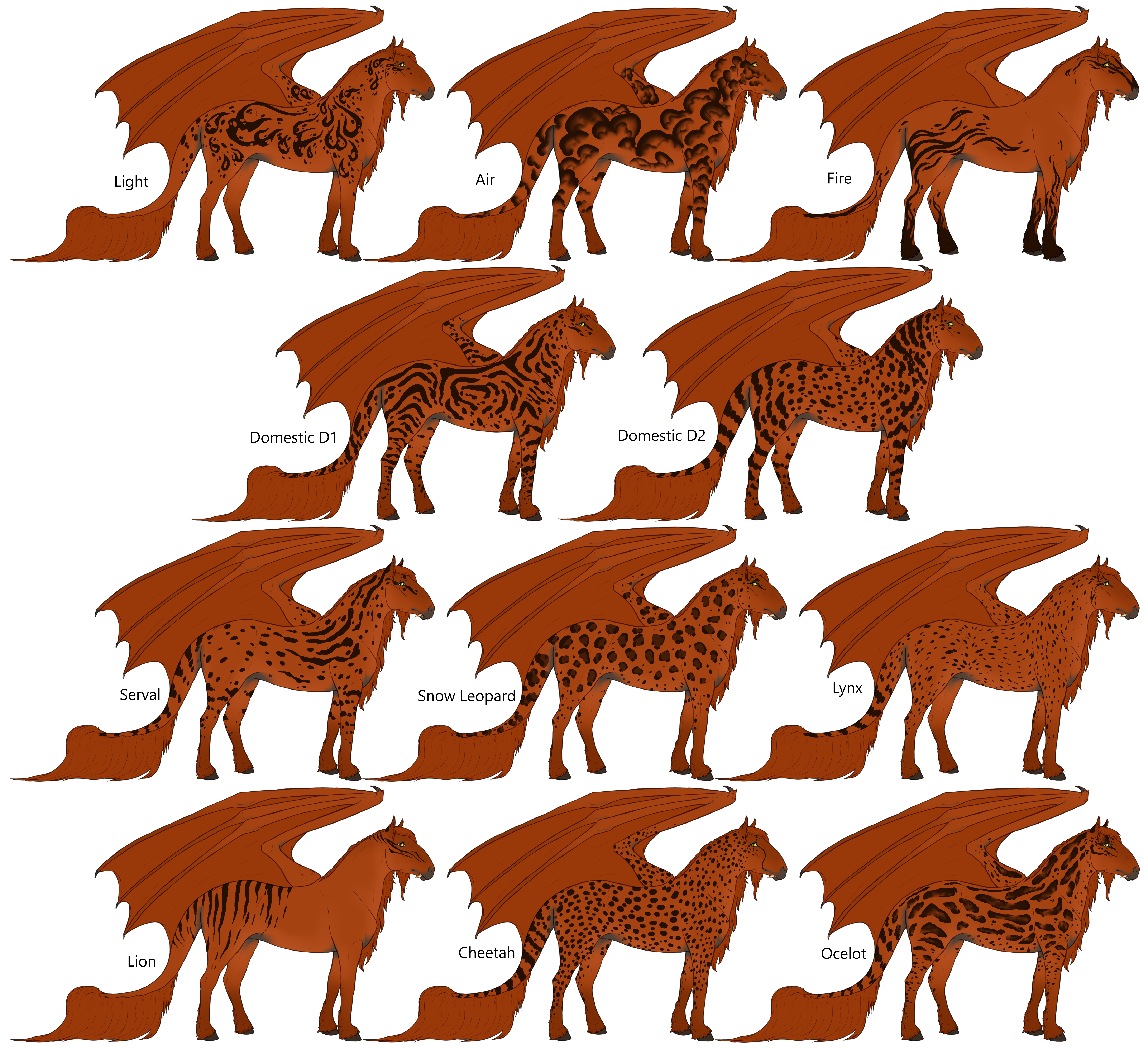 Domestic D1, domestic D2, lion, cheetah, ocelot, serval, snow leopard, lynx, Light*, Fire*, Air*